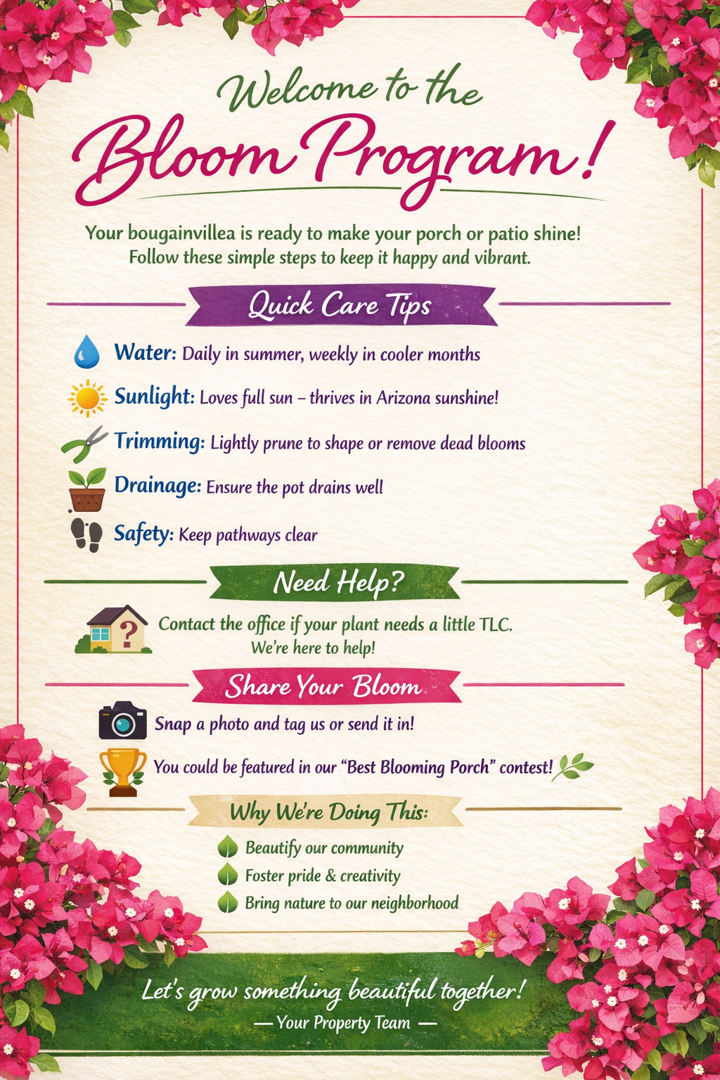 Our "Bloom Program" is our community initiative to bring vibrant color, life, and creativity to our front porches and patios. Through this program, residents can receive a bougainvillea plant to plant in a pot outside their unit and help make our neighborhood more welcoming.